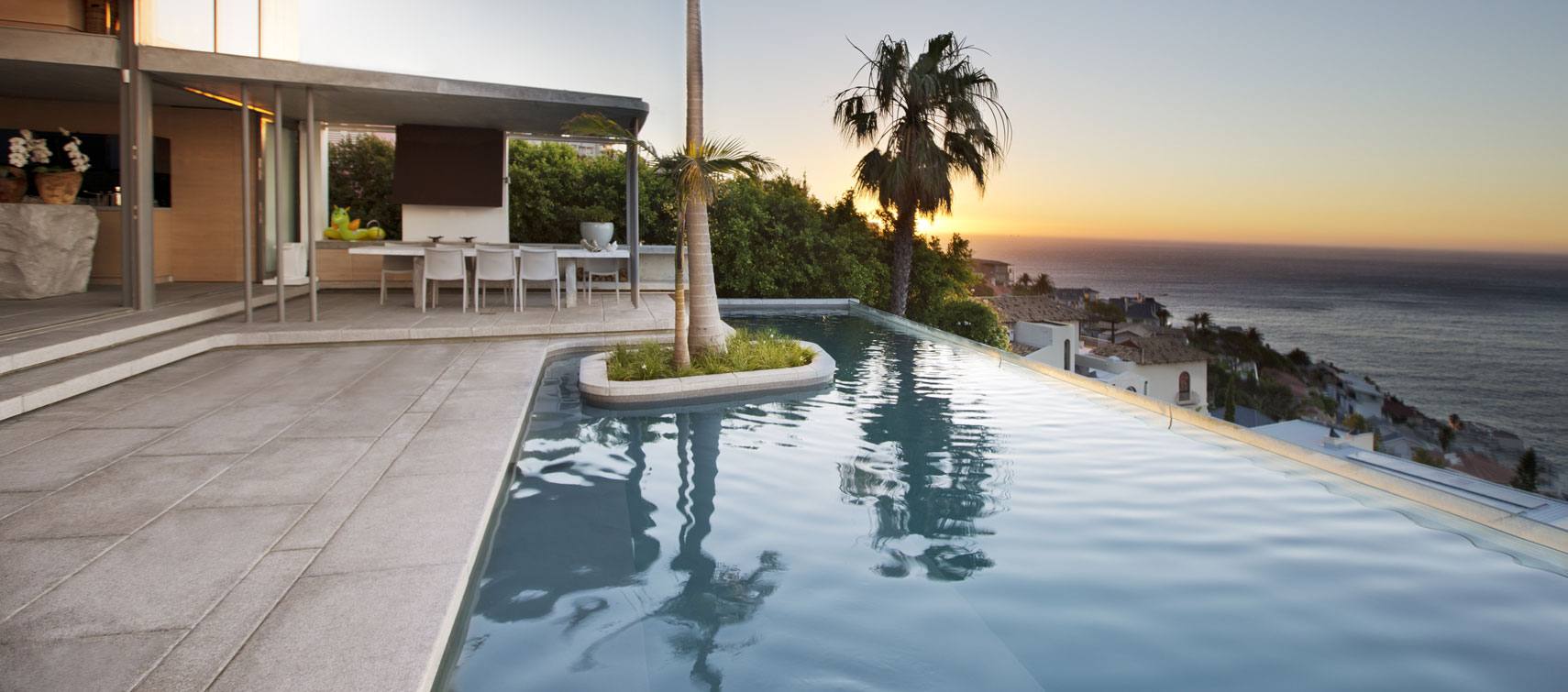 A zero-edge pool appears to sit flush with the terrace — the walls dissolve into the water surface. An infinity pool creates the impression that water extends to the horizon, merging with the landscape beyond.